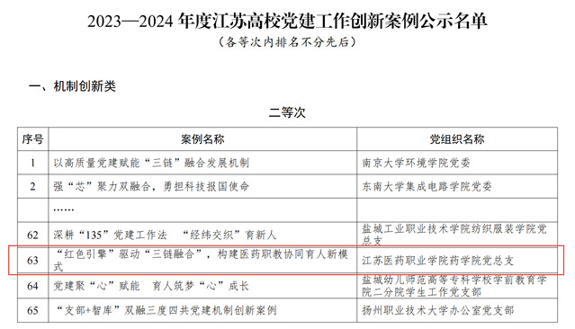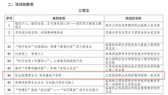近日,江苏省委教育工委公布2023-2024年度江苏高校党建工作创新案例评选结果,学校推荐上报的2项案例凭借鲜明的创新特色与扎实的实践成效全部入选。药学院党总支申报的《“红色引擎”驱动“三链融合”,构建医药职教协同育人新模式》荣获“机制创新类”案例二等次,护理学院第一党支部申报的《校企联建聚合力共话康养产学研》荣获“活动创新类”案例三等次。