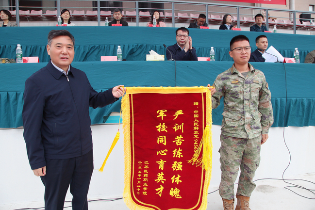 王辉代表学校向承训单位赠送印有“严训苦练强体魄,军校同心育英才”的红色纪念锦旗,向承训单位全体教官以及为本次军训付出艰辛努力的全体工作人员致以最诚挚的谢意。