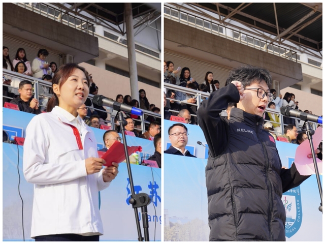 运动员代表23级临床1班游森元同学、裁判员代表施悦老师分别发言并宣誓,郑重承诺积极参赛、公平判赛,展现苏医人良好的精神风貌。